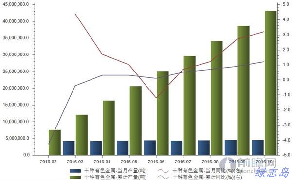 2016年10月十種有色金屬產(chǎn)量455萬噸,當(dāng)月同比增長3.2%;1-10月累計(jì)產(chǎn)量4319萬噸,累計(jì)同比增長1.2%。